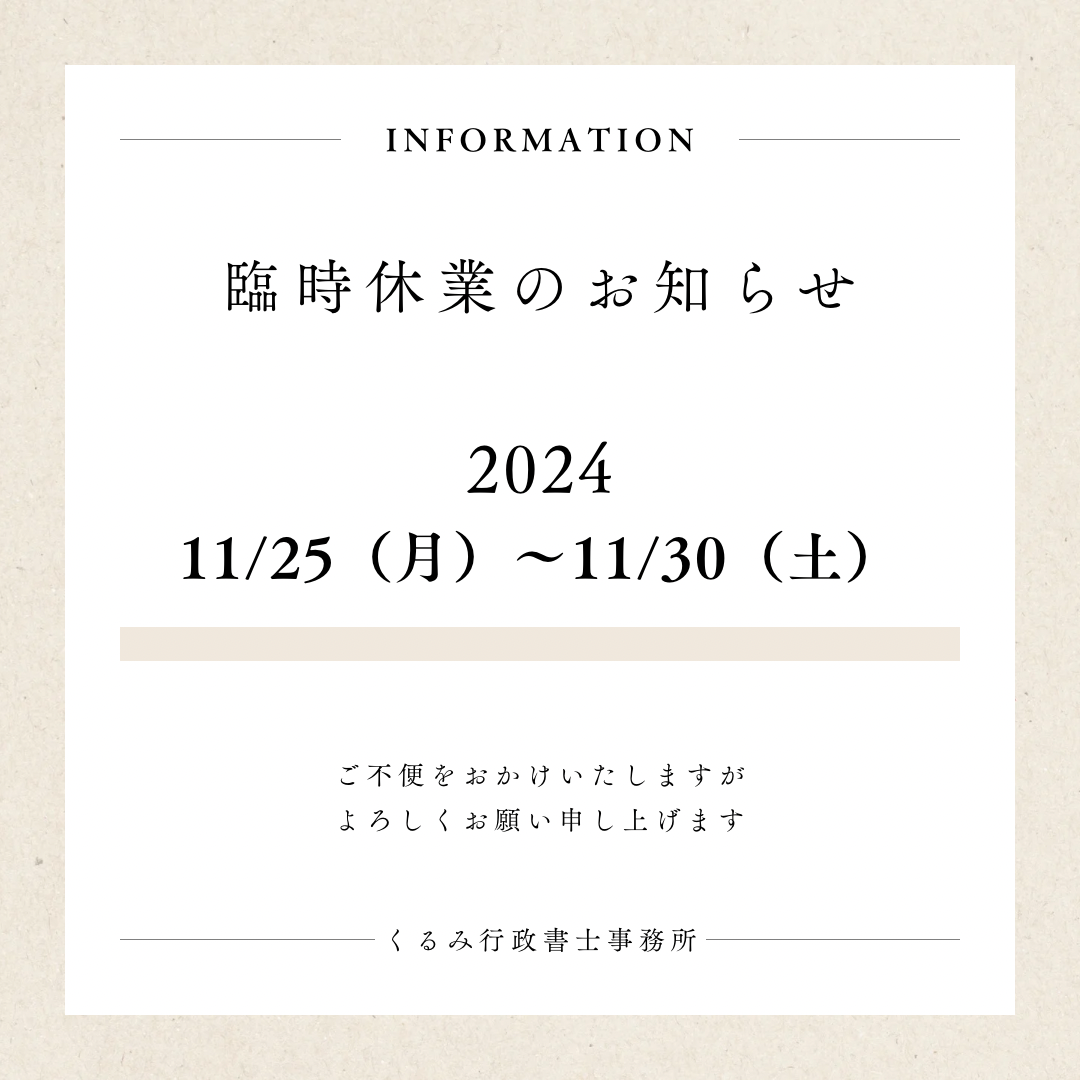 臨時休業のお知らせ 2024 10/29 営業に関するお知らせ 2024年10月29日 誠に勝手ながら、下記日程を臨時休業とさせていただきます。 臨時休業期間 2024年11月25日(月)~2024年11月30日(土) 2024年12月1日(月)から通常通り営業いたします。 ご不便をおかけいたしますが、何卒よろしくお願い申し上げます。 営業に関するお知らせ よかったらシェアしてね! URLをコピーしました! URLをコピーしました! 建設業許可 建設業許可の身分証明書とは?免許証でもOKですか? この記事を書いた人 Pigmon86 関連記事関連する記事はまだ見つかりませんでした。 コメント コメントする コメントをキャンセルコメント ※ 名前 ※ メール ※ サイト 次回のコメントで使用するためブラウザーに自分の名前、メールアドレス、サイトを保存する。